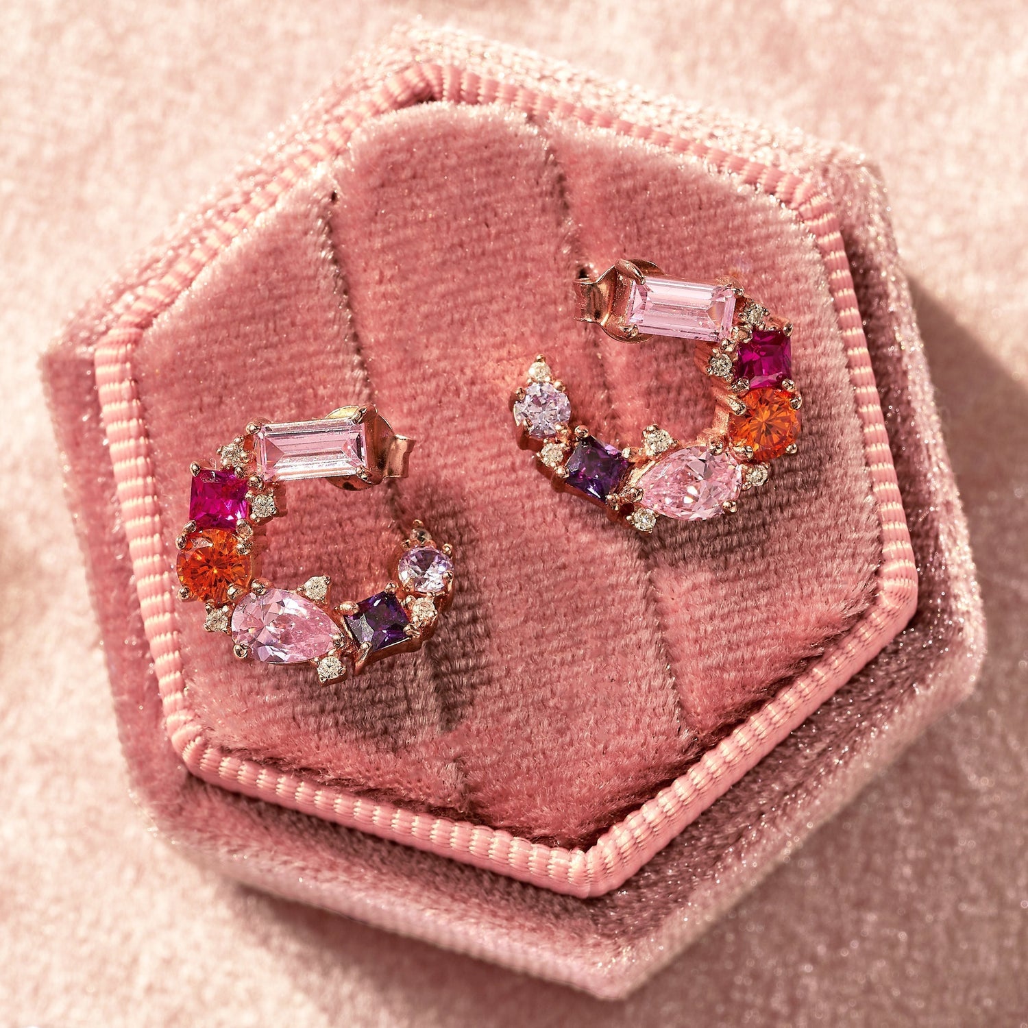 These statement stud earrings wrap elegantly around the lobe, showcasing clusters of Cubic Zirconia in our vibrant ‘Disco’ palette - clear, blush pink, amethyst, orange and fuchsia.