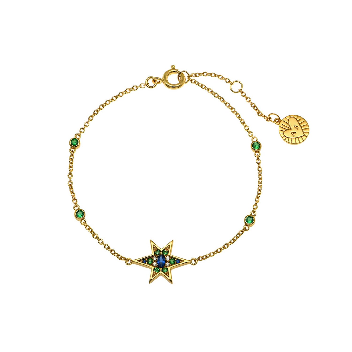 Add some celestial magic to any look with our sparkling Nova north star chain bracelet. A gorgeous marquise cut sapphire blue coloured cubic zirconia at the centre surrounded by a scattering of emerald green and clear cubic zirconia sparkles, finished with glimmering 18k gold plating.