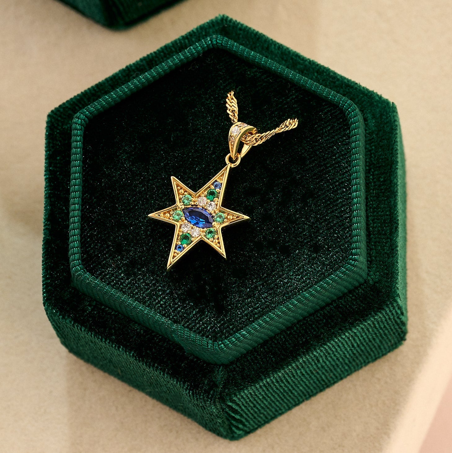 Say hello to Nova, as seen on ITV's This Morning - prepare to look out of this world with our standout pendant necklace! A gorgeous marquise cut Sapphire coloured Cubic Zirconia at the centre surrounded by a scattering of Emerald Green and Clear Cubic Zirconia sparkles, finished with glimmering 18k Gold Plating.