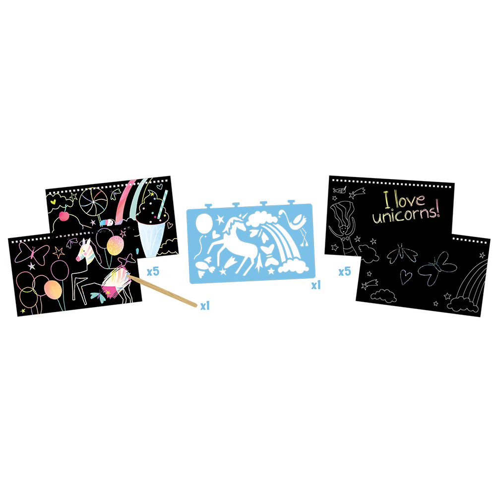 Scratch away and play! Hours of creative fun can be had with our Scratch & Play spiral bound books. Inside you'll find 10 pre-printed scratch cards containing our fabulous Fantasy illustrations - mermaids, butterflies, unicorns, rainbows and more. Using the wooden stylus included you can scratch to 'colour in', create new lines or coloured shapes. The stencil card included can be taken out and placed anywhere in the book, meaning you can follow the guidelines to scratch unicorn, rainbow, flamingo shapes and more!