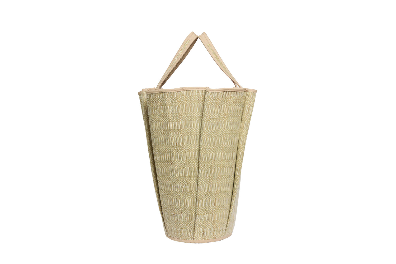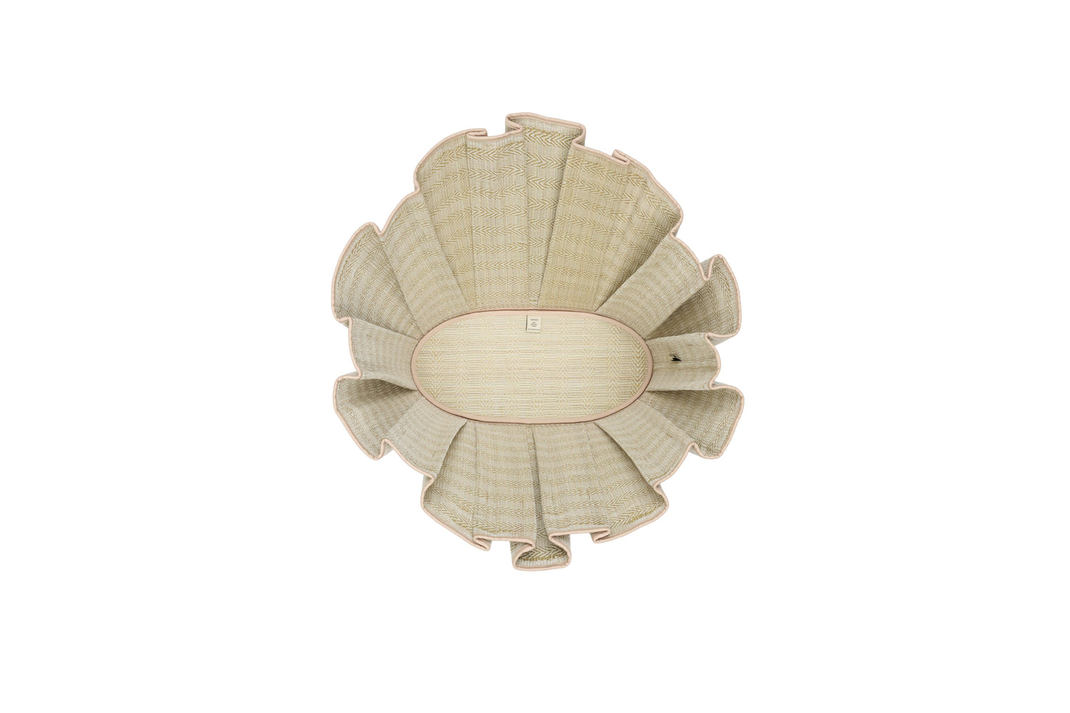 Avoca features white coloured thread woven in an alternating diagonal geometric pattern, through its natural grass fibre base, with pale apricot-coloured fabric trimming.