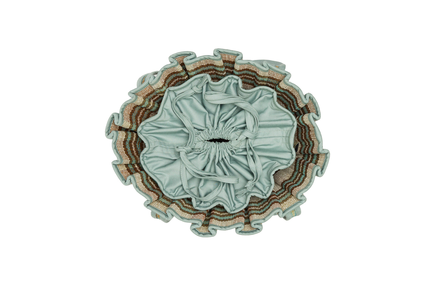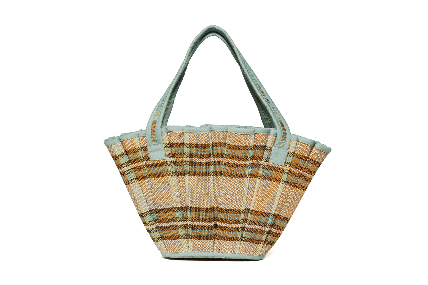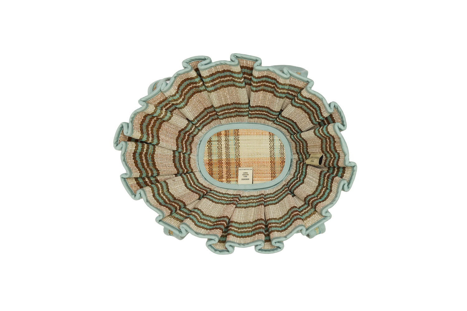 Lake Como features milk-white, bisque-brown and lagoon-green thread colours woven horizontally through the striped sections of natural and tan hand-dyed grass fibres, with pale-green fabric trimming.