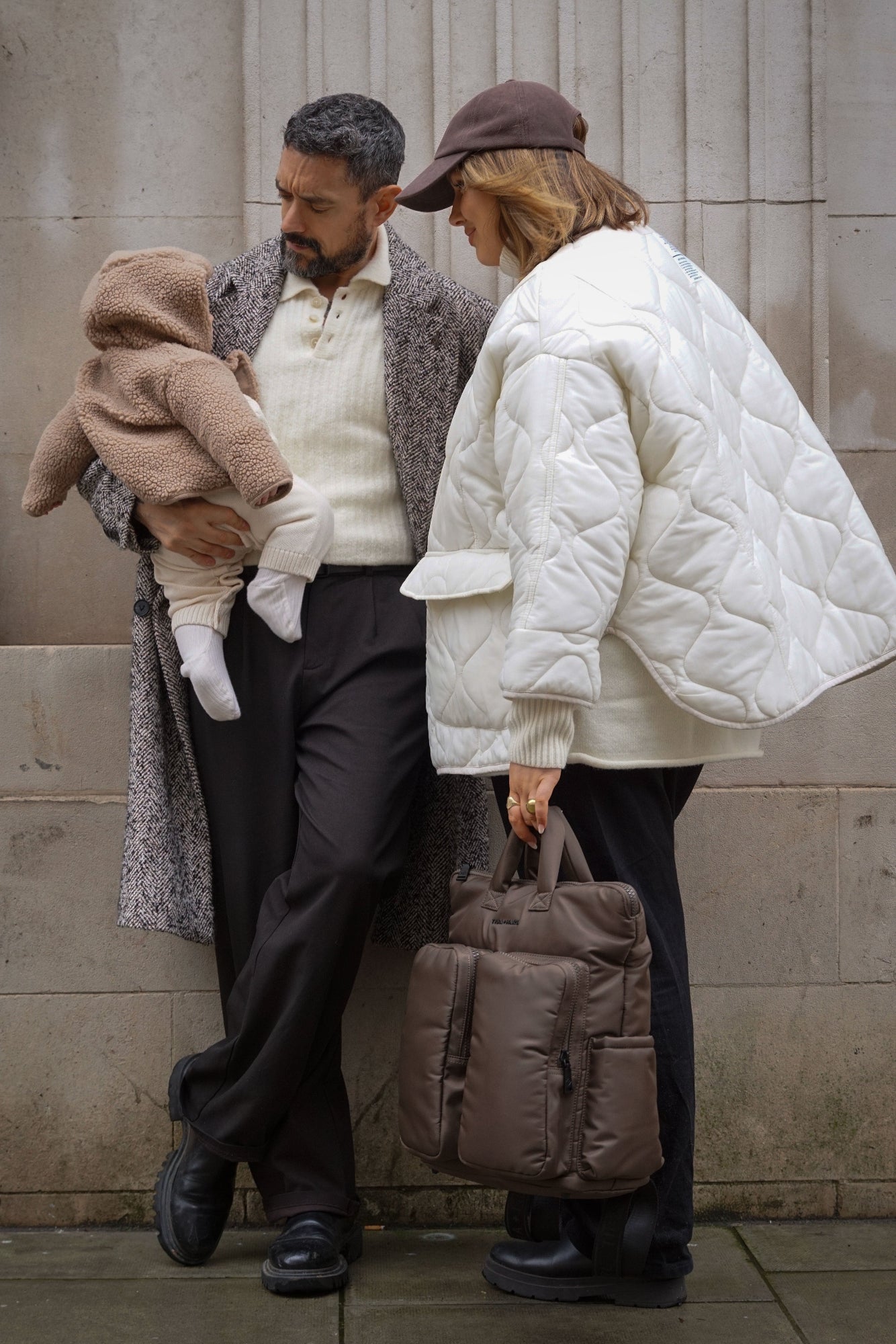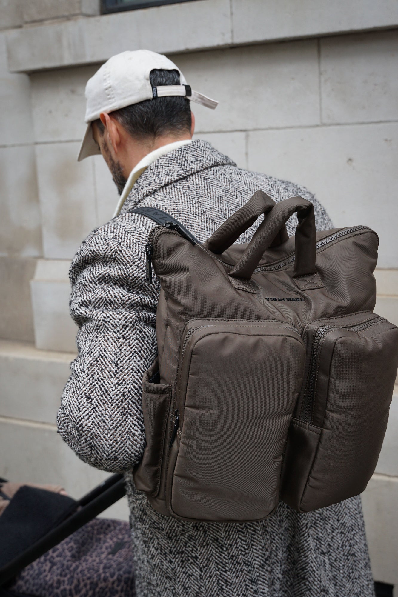 Introducing Ozzy, our new utility tote/backpack. Ozzy's hybrid design lets you wear this bag as a backpack, or hand-held tote, and can also be clipped to your buggy for hands-free strolling. Crafted from Chocolate toned Nylon, set back to gun hardware, with 100% recycled lining + change mat. The design is characterised by two spacious pockets upfront (one being fully insulated, and the other featuring an internal mesh slip) providing you with plenty of storage space for parenting essentials. Its main compartment features a laptop sleeve and bottle holders for extra organisation. Showerproof, ada