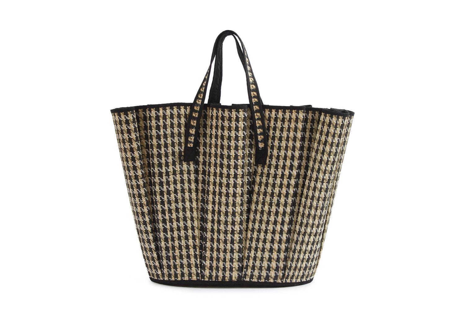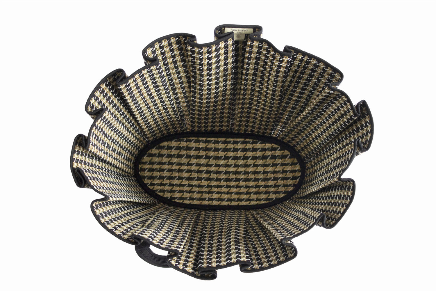 Roma features white and black alternating thread colours woven through its striped natural and black hand-dyed fibre base, with a black fabric trimming and a houndstooth inspired check pattern.