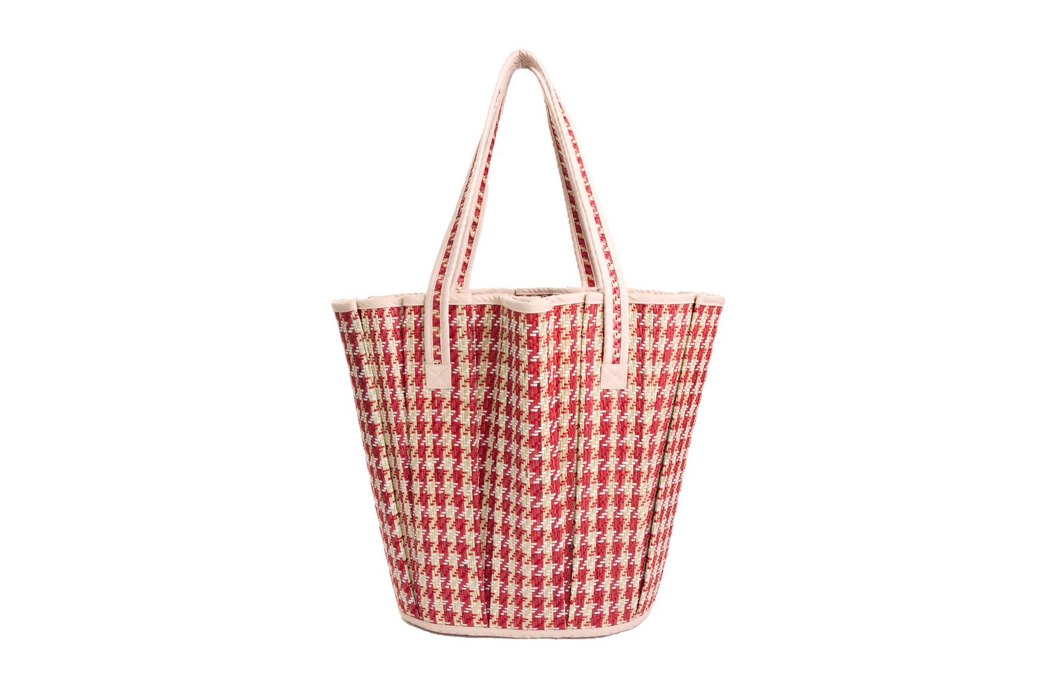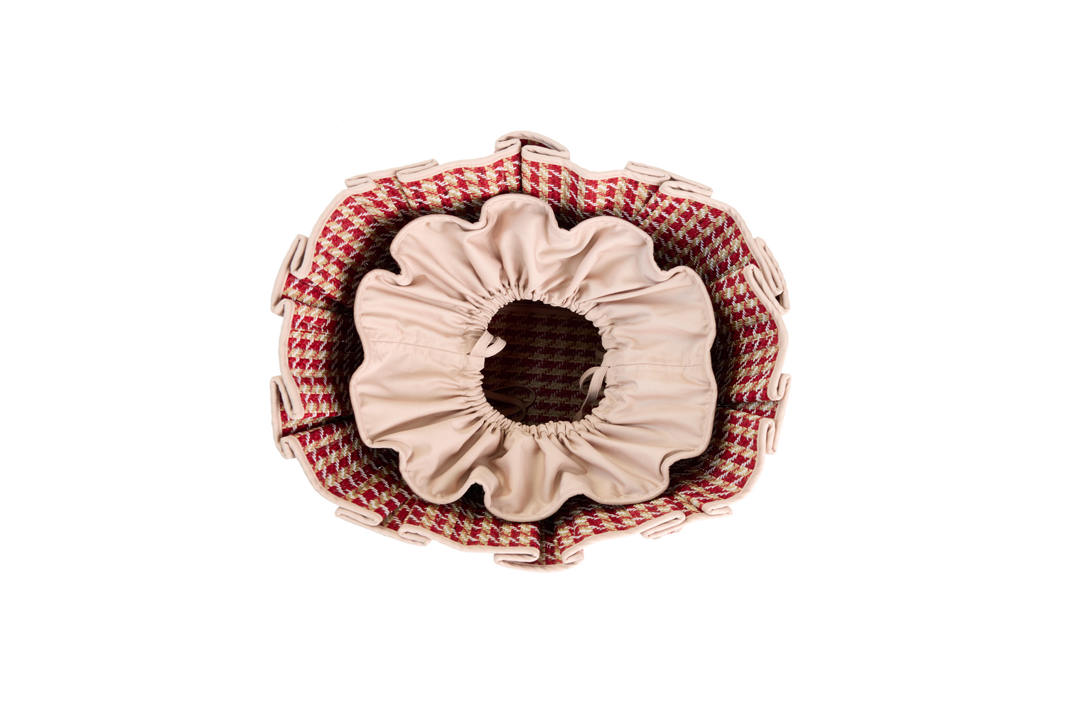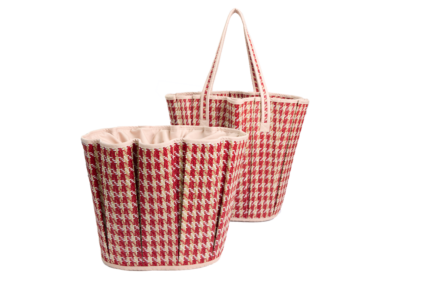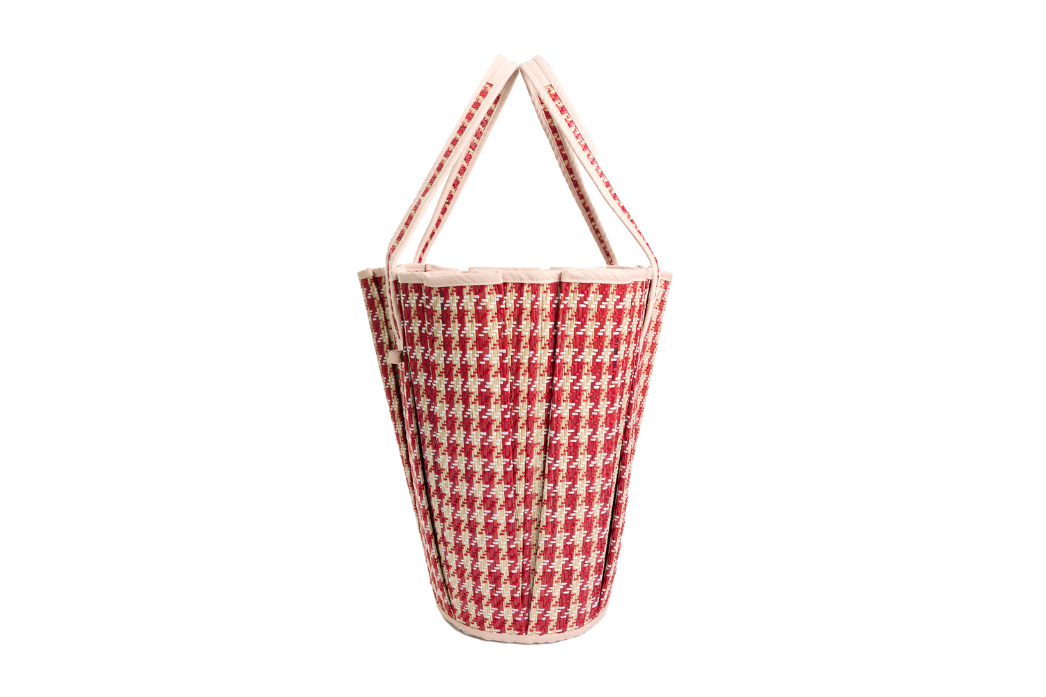 Vernazza Coast features ivory and scarlet alternating thread colours woven through its striped natural and ruby red hand-dyed fibre base, with a toffee brown fabric trimming and a houndstooth inspired pattern.