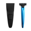 A metallic blue razor selected by Bolin Webb from the world of automotive colours – a reference to the iconic Austin Healey with its striking blue side panel and elegant curve. Presented here in a luxury set with its smart travel companion – the uniquely compatible silicone razor case.
