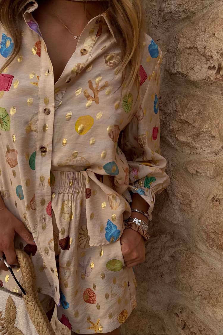 In a soft cream base with a gold fleck and colourful shell print that adds a extra touch of NFD! Our elissa shorts are easy to style, whether it's with a classic rib tank or swimwear for a stroll along the beach or paired with the matching shirt and heels for a soft night out look.