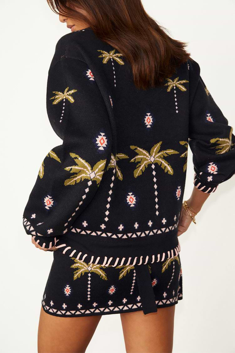 A really weighty soft stretch knit, woven with a geometric pattern featuring palm trees that have become NFD emblems. With a wrap tie waist for multiwear purposes and adjustable coverage. Pair with the matching cardigan or add to some sneakers and a tee.