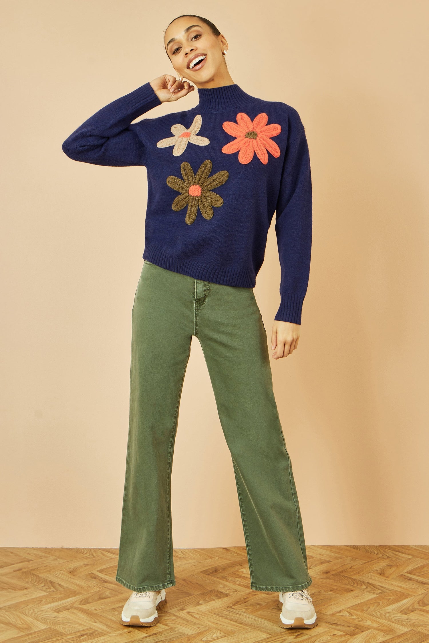 Yumi Navy Knitted High Neck Jumper With Applique Flowers