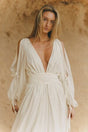 Introducing our new Gypsy- lux free flowing gown, the Bohemia. Crafted in our handwoven and beautifully textured raw organic cotton. The effortless Bohemia dress is a dream for your barefoot luxe destinations. Swathes of breathable organic cotton create our signature appeal of both drama and freedom. Featuring an ultra low plunging neckline, long wrap around belt, high front split and adjustable arm openings. Available in white and sandstone Ethically Hand made by our artisans S/M/L Cut for a loose fit Handwash