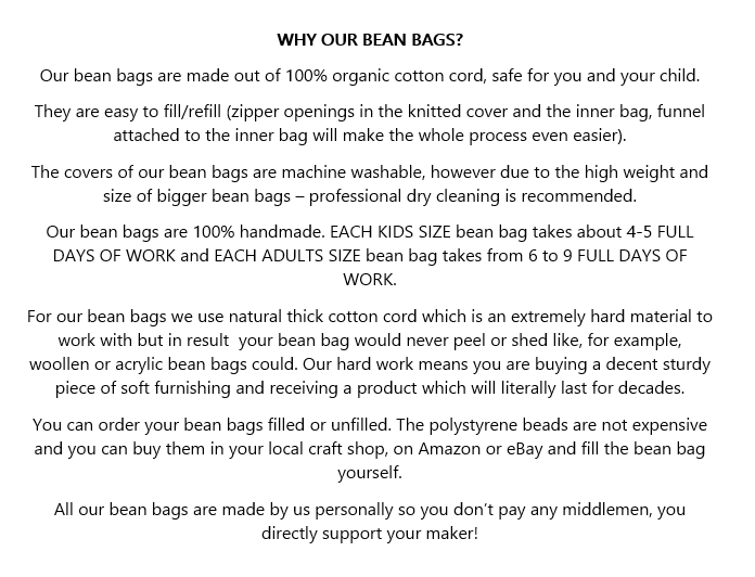 Due to the size and volumetric weight of our bean bags the cost of delivery of filled and ready to use items is often significant (especially for the overseas shipping). To help our customers to reduce this cost we also offer our bean bags without filling. The filling (polystyrene beads / shredded foam) is not expensive and widely available online and on local markets. The process of filling the bean bag is not complicated at all. Both covers (knitted and liner) have zippers and funnel to make it as easy as possible.
