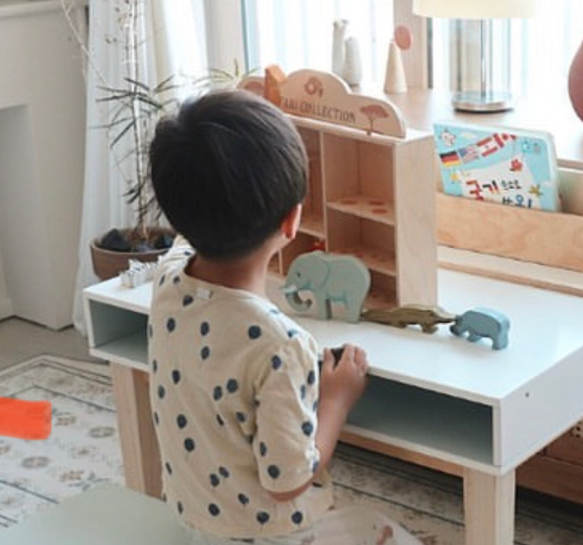 Desk set includes a sturdy stool, 3 pencil and pen holders with woodland forest animal faces, and some handy compartments to store papers, books and folders.
