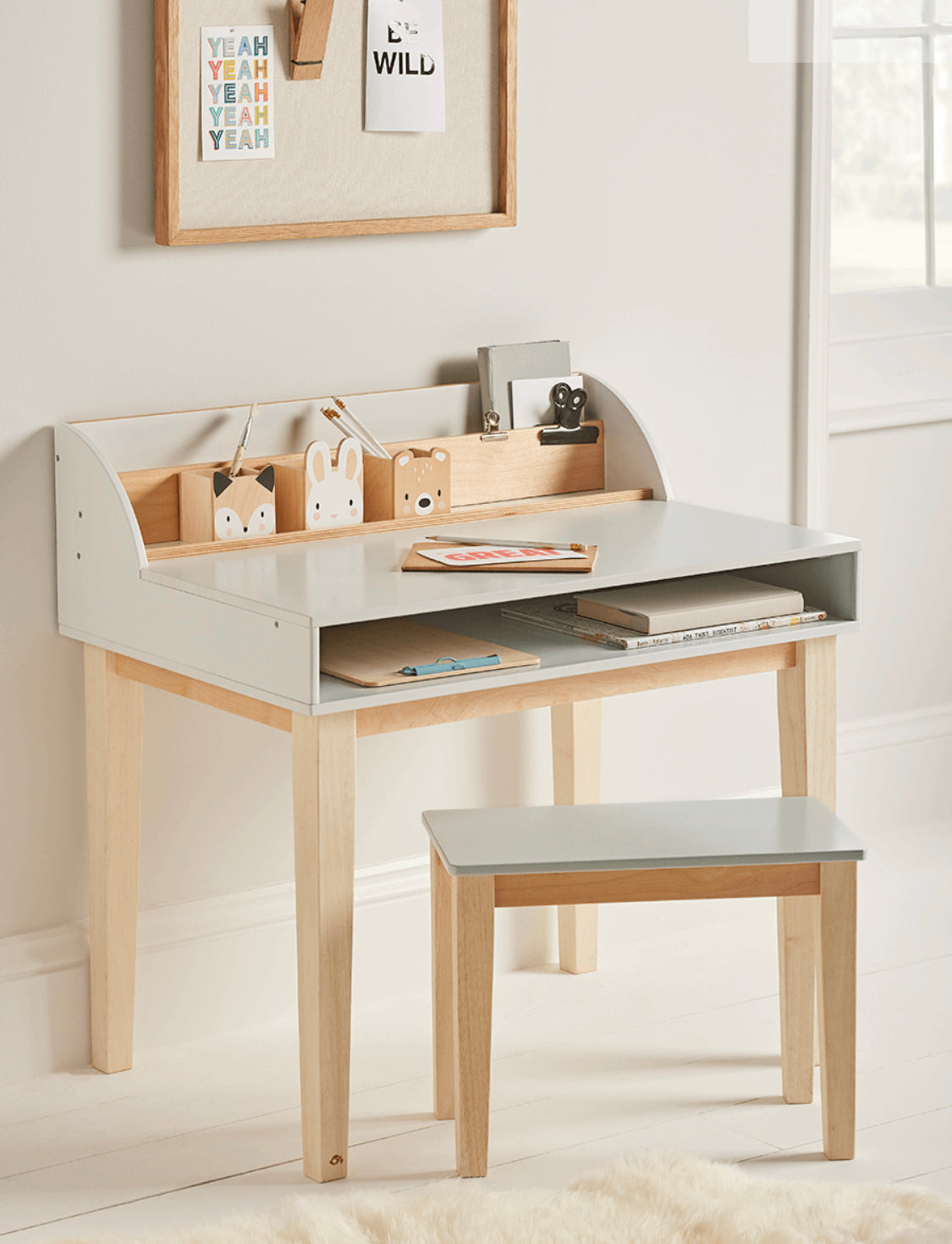 We have answered your prayers with this gorgeous addition to any child's bedroom or nursery! This completely plastic-free wood desk set has been made especially for children, and has been designed for any craft activity or homework set up. What better way to work than on something beautiful?