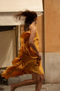 This style has been cut from 100% organic silk that falls loosely to a floor-sweeping hem with ultra low back. The floaty 'Syros' has been hand dyed in a golden saffron for the ultimate go to statement dress.