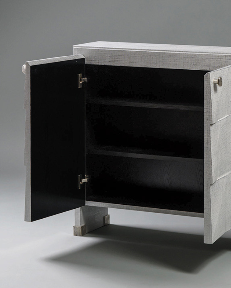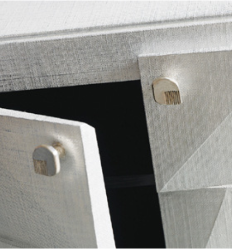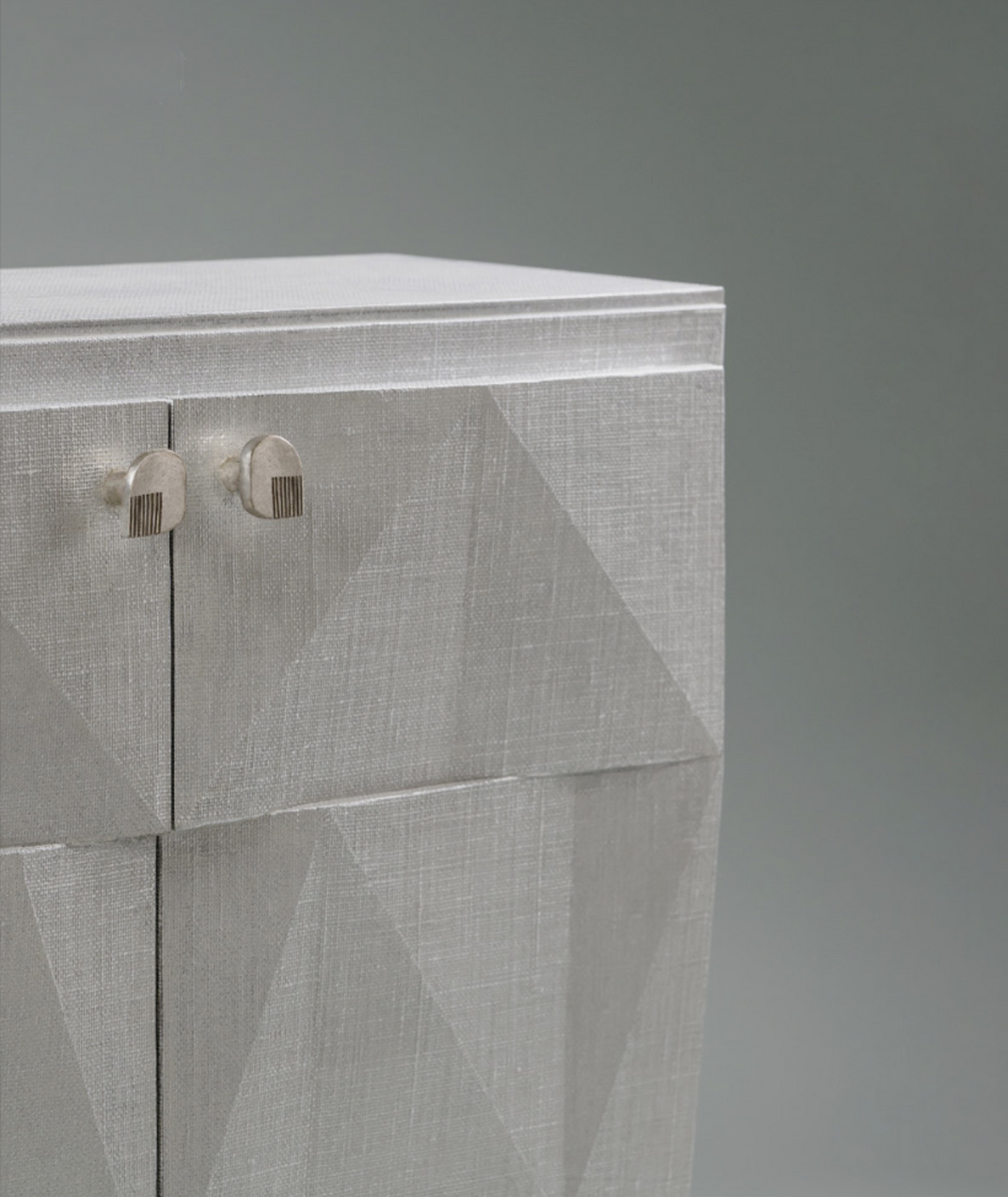 The Elena Console Cabinet blends geometric artistry with refined materials, creating a striking focal point for any interior. Wrapped in luxurious silver linen and finished with an elegant silver bronze handle, its sculptural façade opens to reveal a rich dark oak interior. Both functional and decorative, this compact yet impactful piece is perfect for hallways, living spaces, or as a statement storage solution.