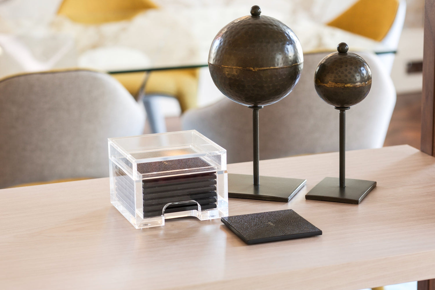 Complement your coffee table with our stylish Acrylic Coastbox in faux shagreen chocolate, a fabulous rich shade of the deepest brown mixed with complementary sub-shades complete with a sophisticated textured finish. This unique Coastbox holds eight handcrafted coasters, presented in a crystal clear acrylic box, doubling up as an elegant storage solution when not in use.
