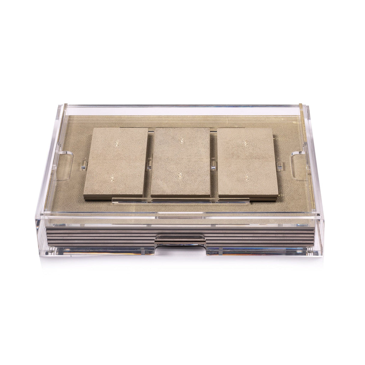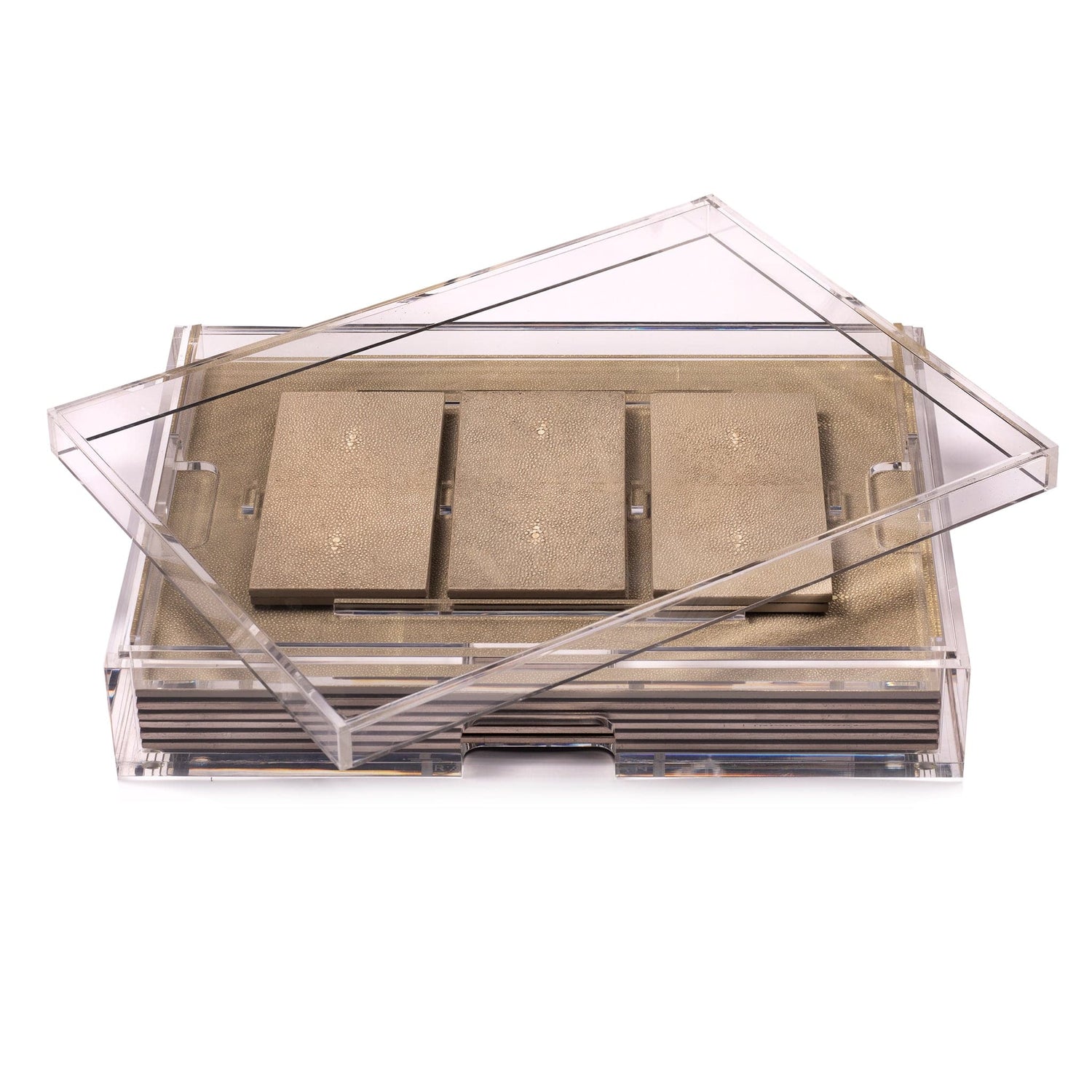 Complement your dining table with our Acrylic Grand Matbox in Faux Shagreen Natural, inspired by soft, natural hues complete with a sophisticated textured finish. The Grand Matbox is a unique collection of silver leaf placemats and coasters for a table setting of six. Available in a choice of silver or gold leaf lacquered boxes handcrafted by local artisans or alternatively for a more contemporary approach with crystal clear boxes made from precision cut acrylic. This exquisite set consists of six grand placemats and six double coasters designed to accommodate wine and water glasses at the same time. Either option is the ultimate finishing detail for your table setting as well as an elegant decoration for your home.