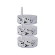This storage set has three rounded trays with raised edges to store smaller items. Each tray is attached to a pointed, central rod that allows them to swivel around with a quick way to access them from any angle. Translucent plastic accentuates the black and white speckled detail on trays, complemented with a chic white inner.