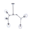 This striking lamp stretches across the ceiling like a heavenly constellation. Its frame is crafted from tough iron and has a reflective silver finish. Each bulb is housed in a round shade made from clear glass.