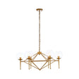 ""The geometric frame of the Abira pendant lamp is crafted from iron and features a luxe gold finish. Six sconces each hold a clear glass shade, with a candle-style light housed within. A gold finish chain applies the finishing touch."