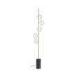 This five bulb floor lamp has a brass finish metal stand supporting five spherical lampshades. The cylindrical black marble base provides durable support to the stem and complements the sleek aesthetic.