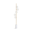 This five bulb floor lamp has a brass finish metal stand supporting five spherical lampshades. The cylindrical white marble base provides durable support to the stem and complements the sleek aesthetic.