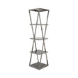 The Ackley shelf unit is comprised of five square shelves, tiered to create a tall statement piece. Each shelf is made from tempered glass and has a sleek black finish, counterpointing the cool metallic frame. The stylish silver finished frame features a distinctive angular design that creates the illusion of the frame being twisted.