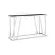 The Ackley console table is a comtemporary statement piece boasting reflective finish. Created from smooth stainless steel, the cool metallic finish of the table's frame contrasts with the black tempered glass top.