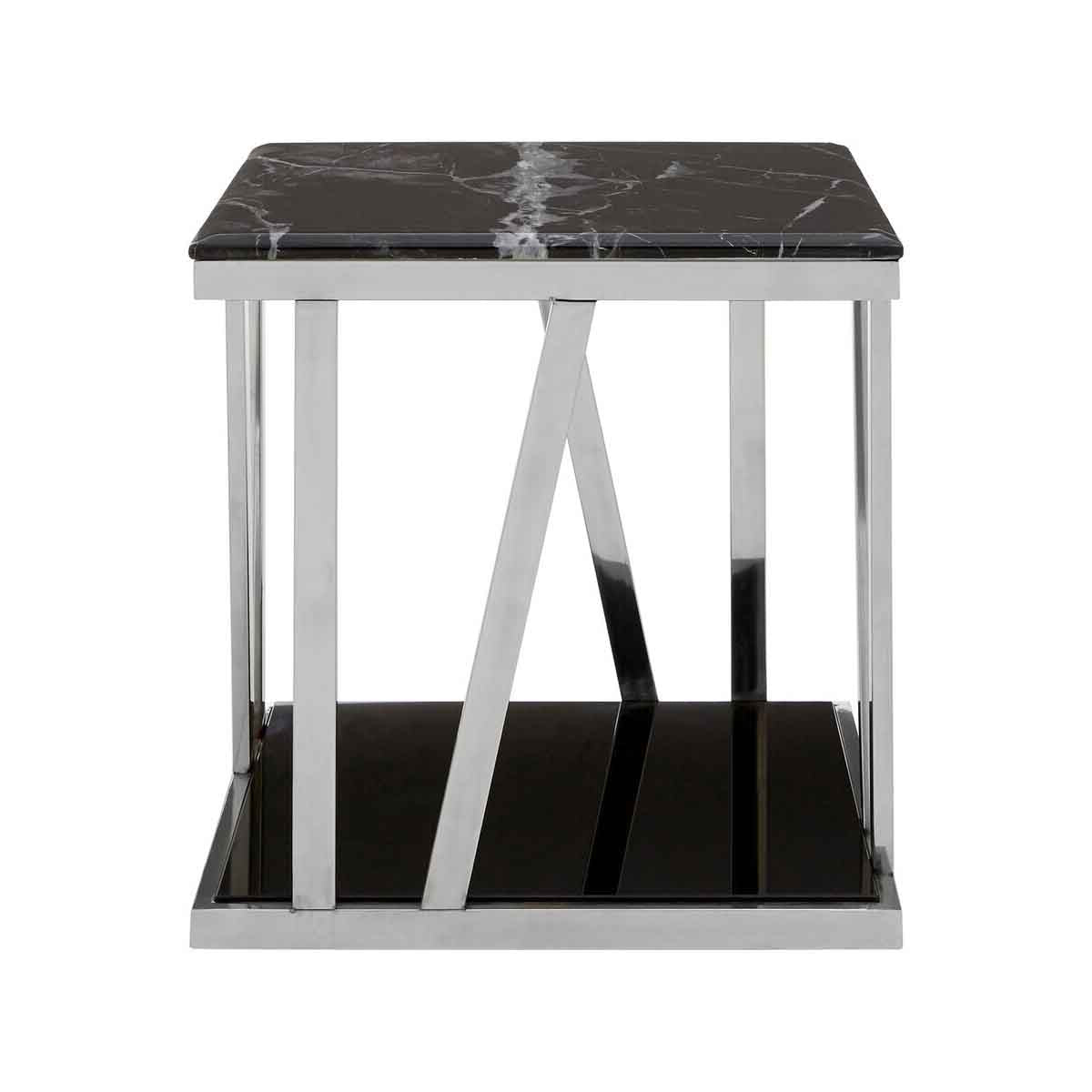 Its frame is made from smooth stainless steel and has a sleek and reflective finish. Straight and angular lines combine to attract the eye, adding to the contemporary look of this luxe accent piece. Sleek black marble is set into the top. Style with metallic furniture and lighting.