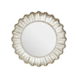 The reflective surface is bordered by decorative rope detail that twines around its circular plane. The frame's outer section is textured by a series of vertical indentations that accentuate the undulating and curling rim. Its champagne finish is gently distressed and complements metallic-toned furniture and textiles.