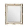 This large rectangular mirror's thick frame is replete with carved foliage motifs and intricate dentil detailing. Their symmetrical arrangement combines with the champagne gold finish to lend an antique look to the mirror.