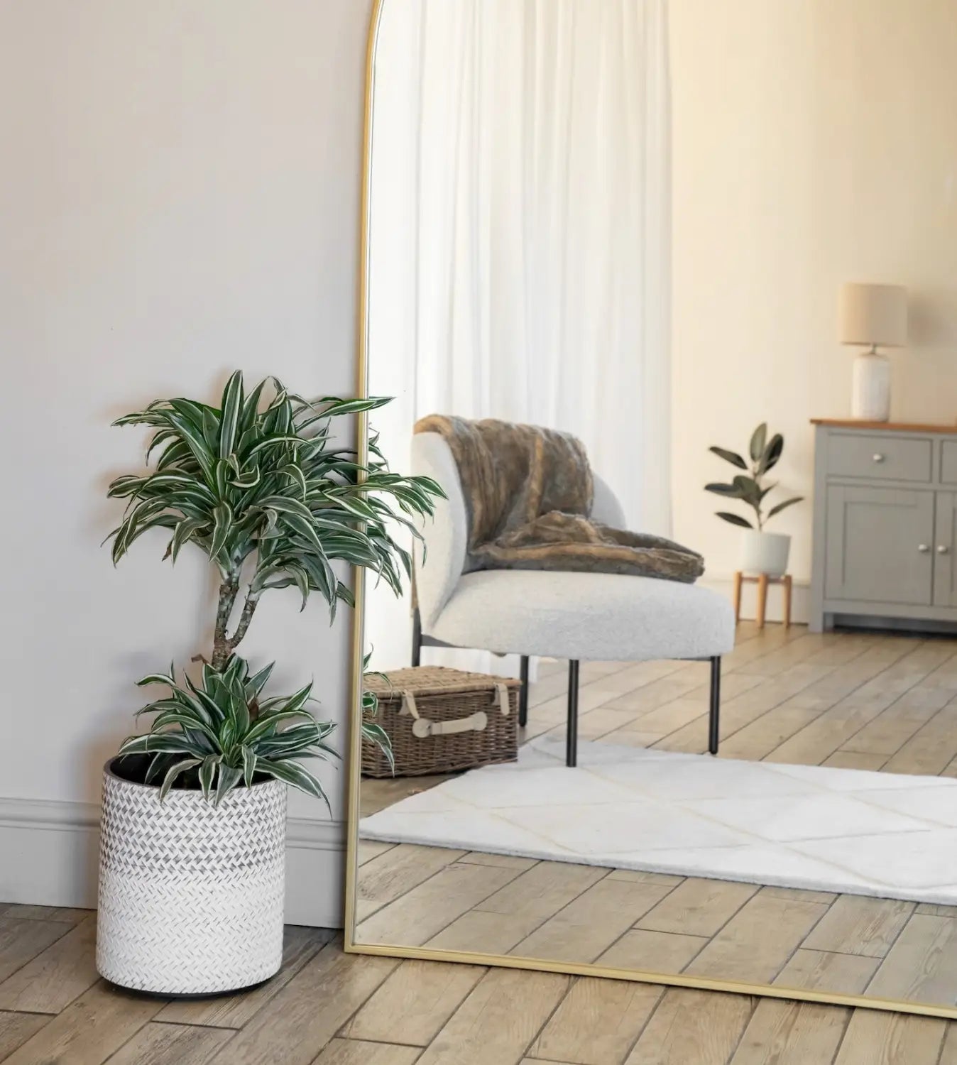 This oversized mirror instantly elevates a master suite or walk-in wardrobe. Its expansive size offers a full-length view ideal for outfit checks, while the graceful arch and rich gold frame add a boutique-like ambiance. Whether placed opposite windows to bounce light or mounted behind a vanity area, the Akiko becomes a centrepiece of calm, curated luxury.