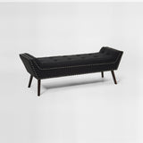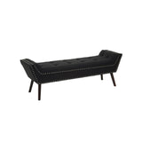 Featuring a button-tufted seat upholstered in tough-wearing black fabric, this bench will make a contemporary addition to the living area. This bench boasts sloping arms with a stud detail, supported with brown rubberwood tapered legs.