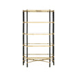 Each of its five shelves are made from clear tempered glass and are cradled by a tall stainless steel frame. The frame is a combination of sleek black and reflective gold. Gold finish stainless steel lines intersect at the base.