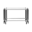 The Allessi console table boasts two tiers of clear tempered glass held in place by a sleek stainless steel frame. Three legs at each side are finished in black and feature chrome accents for a reflective contrast.