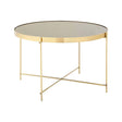 A round pane of mirrored glass is set into a band of metal. The metal has a brushed bronze finish that complements the black glass. A simple metal lattice supports the tabletop, attached to which are four slim legs that give the table a lean aesthetic. Another lattice is formed at the base to create angled lines that counterpoint the round tabletop.