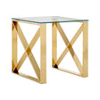 Its legs are made from smooth stainless steel, with a reflective champagne gold finish that complements warm metallic furniture and lighting. Both square shaped legs feature a diagonal cross design. The tabletop is made from transparent tempered glass, and is separated from the legs by four square chrome metal pads.