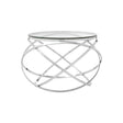 Its distinctive legs are formed from four large stainless steel hoops that overlap. The polished silver finish makes it highly reflective, and allows it to be coordinated easily with metallic furniture. A fifth, horizontal hoop is positioned at the top as a base for the clear tempered glass tabletop.