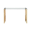The frame is made from stainless steel, and has a reflective gold finish with sides that boast a rectangular inset feature. The top is made from clear tempered glass. It looks great styled with metallic accessories.