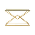 Its base is created from two stainless steel triangles, inverted to create a symmetrical look. Both triangles merge at the tip to create a diamond shape that appears to be suspended in mid-air. The steel has a rich champagne gold colour that complements warm metallic accessories. Display a geometric accent lamp on its clear tempered glass top.