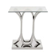 Its base and stand are made from sleek stainless steel and have a mirrored finish that complements silver coloured metallic accessories. The arcing lines of the stand soften the look, subverting the sharp angles of the base and top. The clear glass top creates a light finish and adds to the table's contemporary appeal.