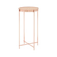 Its tall and slender tubular rose gold legs give this table a contemporary minimal look. A pair of slim metal lines intersects at the base, with a matching design at the upper section that holds the tabletop in place. A band of polished metal wraps around the tabletop's rose gold mirrored surface, enhancing the reflective appeal of this contemporary accent piece.
