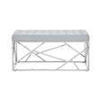 The plump cushion is dressed in soft velvet, with a button tufted finish that creates a quilted finish. The base is made from smooth stainless steel and boasts a reflective silver finish that complements the upholstery. Angled lines dart across the base.