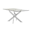 This contemporary dining table features a rectangular clear glass tabletop supported by four intersecting chrome metal legs. The sleek, angular design and transparent glass will add a touch of modern simplicity to any space.
