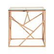 The base of the Allure side table uses thin lines of stainless steel to create a striking angular pattern. Its reflective rose gold colour gives it an opulent, Boutique look. The tabletop is formed from a single sheet of transparent tempered glass adding a reflective accent to the table.