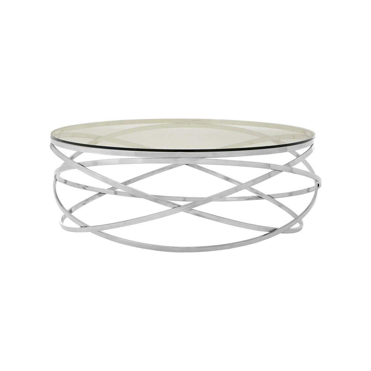 This coffee table features a unique design with four silver finish stainless steel hoops that are interlinked in a swirl pattern. The tabletop is made of clear tempered glass, adding a modern touch to the overall look.