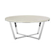 The Allure coffee table's round surface is made from faux marble, with grey veining detail offsetting the white. It rests upon a sliver of silver coloured metal that transitions into the angled metal legs. The simple lattice design at the base of the legs creates flow, enhancing the allure of this luxurious boutique hotel style piece.