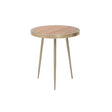 This side table has a rounded tabletop made from natural acacia wood in a natural finish. The tabletop has a gold finish aluminium border that extends to form angular legs, offering a mid century modern aesthetic.