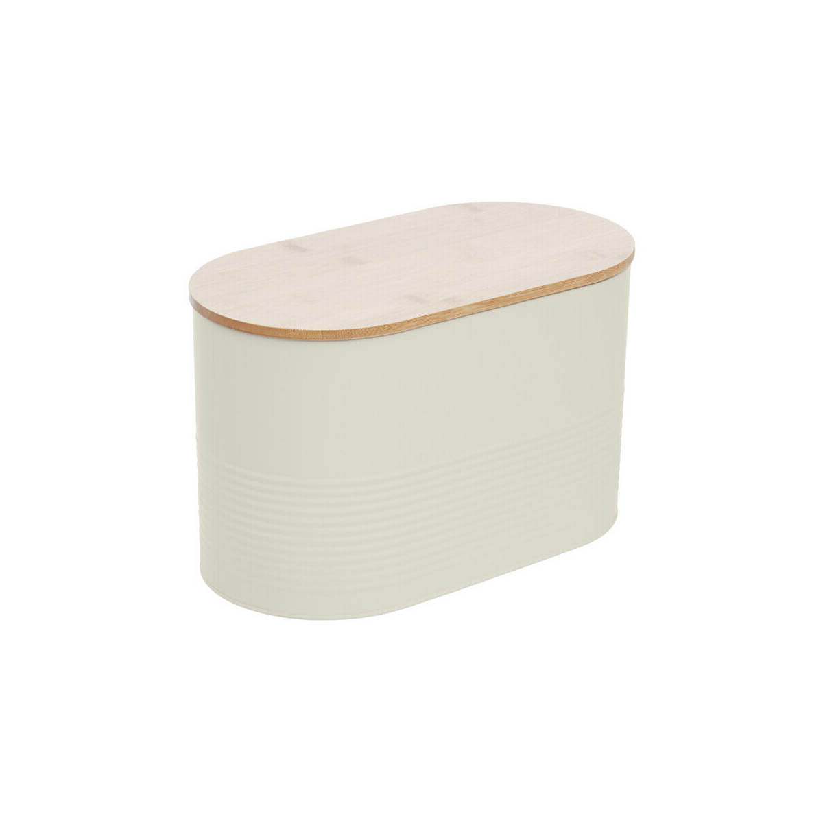 Crafted from sturdy metal, this oval shaped bread bin has a smooth surface in cream finish accentuating embossed curved lines. A natural bamboo lid sits atop the bin lending it warmth and texture, while keeping the contents fresh and airtight.
