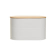 Crafted from sturdy metal, this oval shaped bread bin has a smooth surface in white finish accentuating embossed curved lines. A natural bamboo lid sits atop the bin lending it warmth and texture, while keeping the contents fresh and airtight.